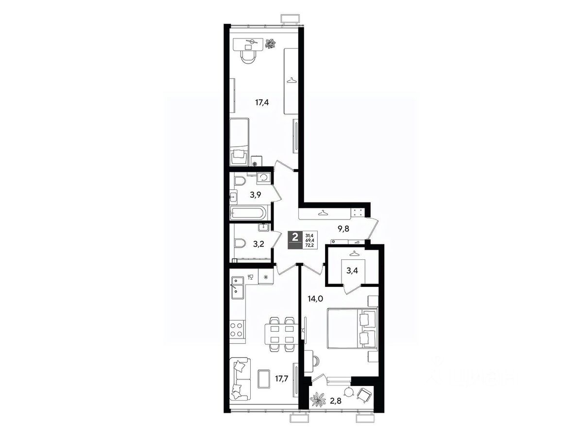 В продаже 2-комнатная квартира от застройщика! Мкр. "DOGMA PARK" г. Краснодар, Литер 8 Срок сдачи: 4 кв. 2026, общей площадью 72.2 кв.м., на 2 этаже.
