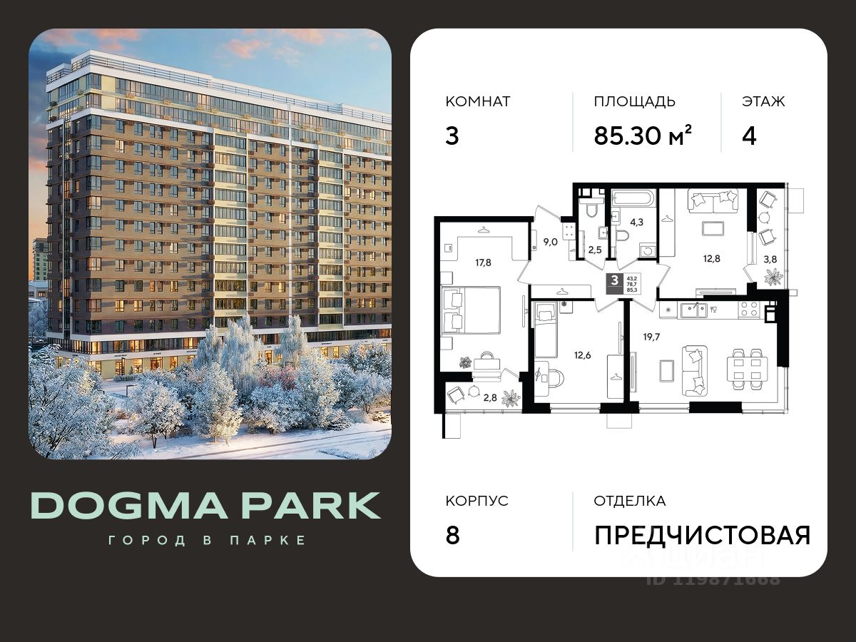 В продаже 3-комнатная квартира от застройщика! Мкр. "ДОГМА ПАРК" г. Краснодар, Литер 8 Срок сдачи: 2 кв. 2027, общей площадью 85.30 кв.м., на 4 этаже.