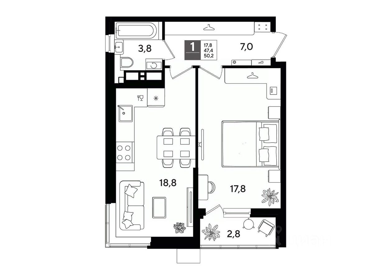В продаже 1-комнатная квартира от застройщика! Мкр. "DOGMA PARK" г. Краснодар, Литер 8 Срок сдачи: 4 кв. 2026, общей площадью 50.2 кв.м., на 15 этаже.