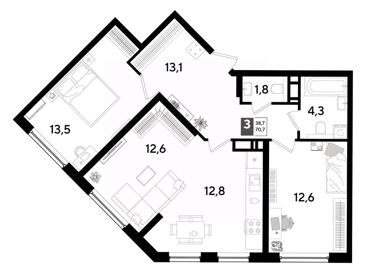 В продаже 3-комнатная квартира от застройщика! Мкр. "DOGMA PARK" г. Краснодар, Литер 32 Срок сдачи: 3 кв. 2027, общей площадью 70.8 кв.м., на 16 этаже.