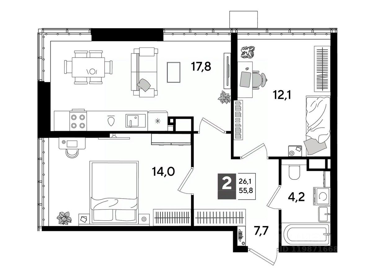 В продаже 2-комнатная квартира от застройщика! Мкр. "DOGMA PARK" г. Краснодар, Литер 18 Срок сдачи: 4 кв. 2027, общей площадью 55.8 кв.м., на 16 этаже.
