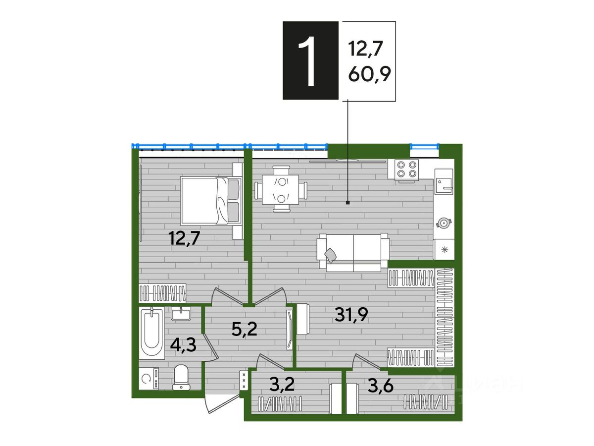В продаже 1-комнатная квартира от застройщика! Мкр. "DOGMA PARK" г. Краснодар, Литер 11 Срок сдачи: 4 кв. 2026, общей площадью 60.7 кв.м., на 2 этаже.
