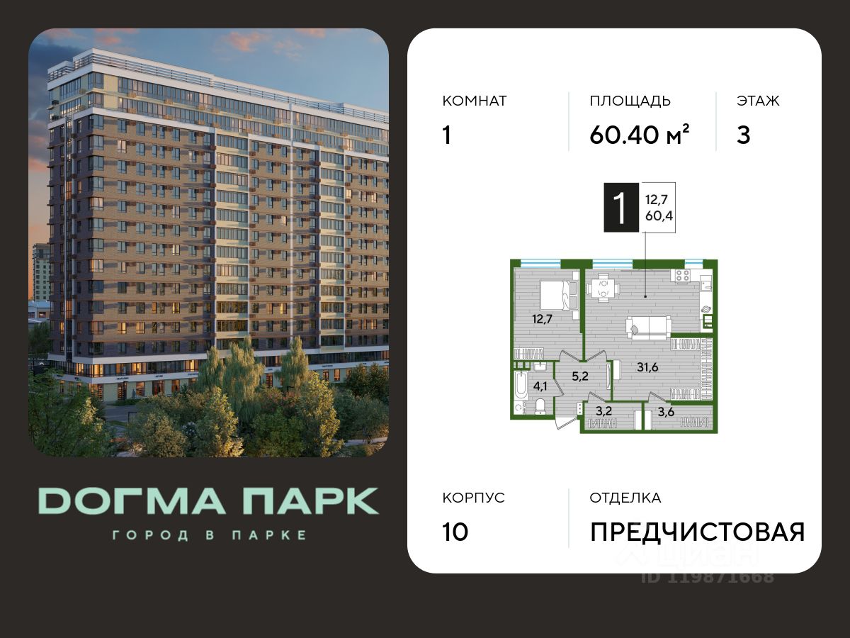 В продаже 1-комнатная квартира от застройщика! Мкр. "ДОГМА ПАРК" г. Краснодар, Литер 10 Срок сдачи: 2 кв. 2027, общей площадью 60.40 кв.м., на 3 этаже.