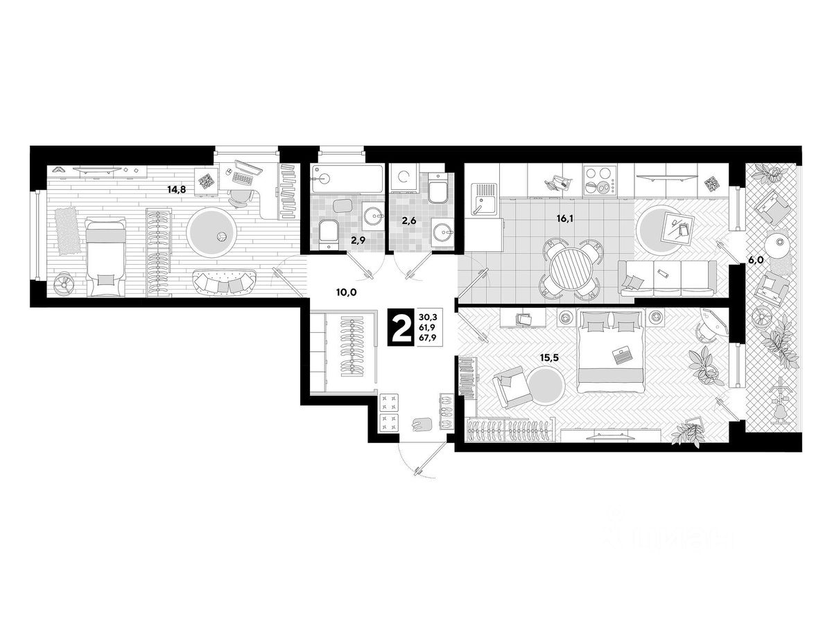 В продаже 2-комнатная квартира от застройщика! Мкр. "Самолет" 5 очередь, г. Краснодар, Литер 25 Срок сдачи: 4 кв. 2024, общей площадью 67.9 кв.м., на 2 этаже.