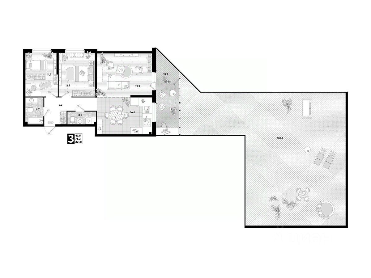 В продаже 3-комнатная квартира от застройщика! Мкр. "Самолет" 3 очередь, г. Краснодар, Литер 15 Срок сдачи: 4 кв. 2023, общей площадью 221.8 кв.м., на 2 этаже.