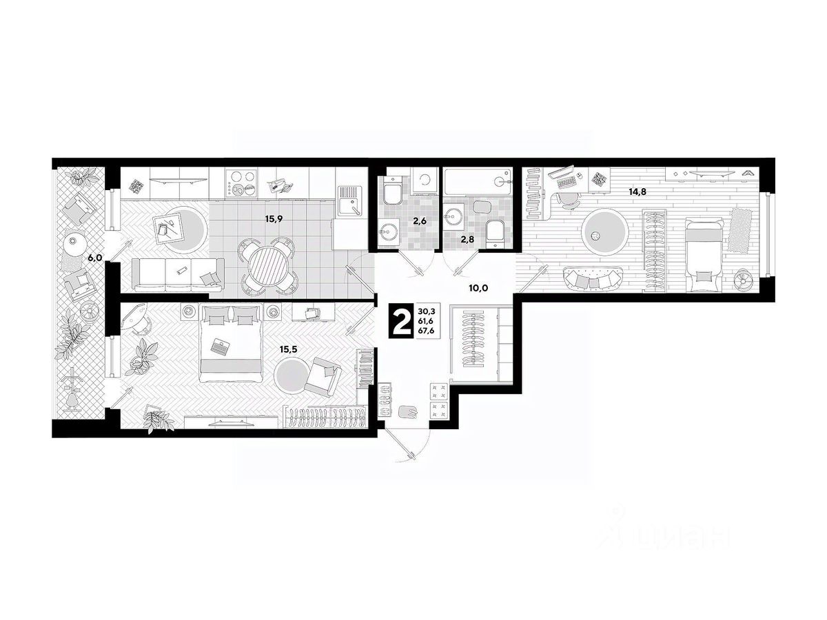 В продаже 2-комнатная квартира от застройщика! Мкр. "Самолет" 4 очередь, г. Краснодар, Литер 24 Срок сдачи: 4 кв. 2023, общей площадью 67.6 кв.м., на 2 этаже.