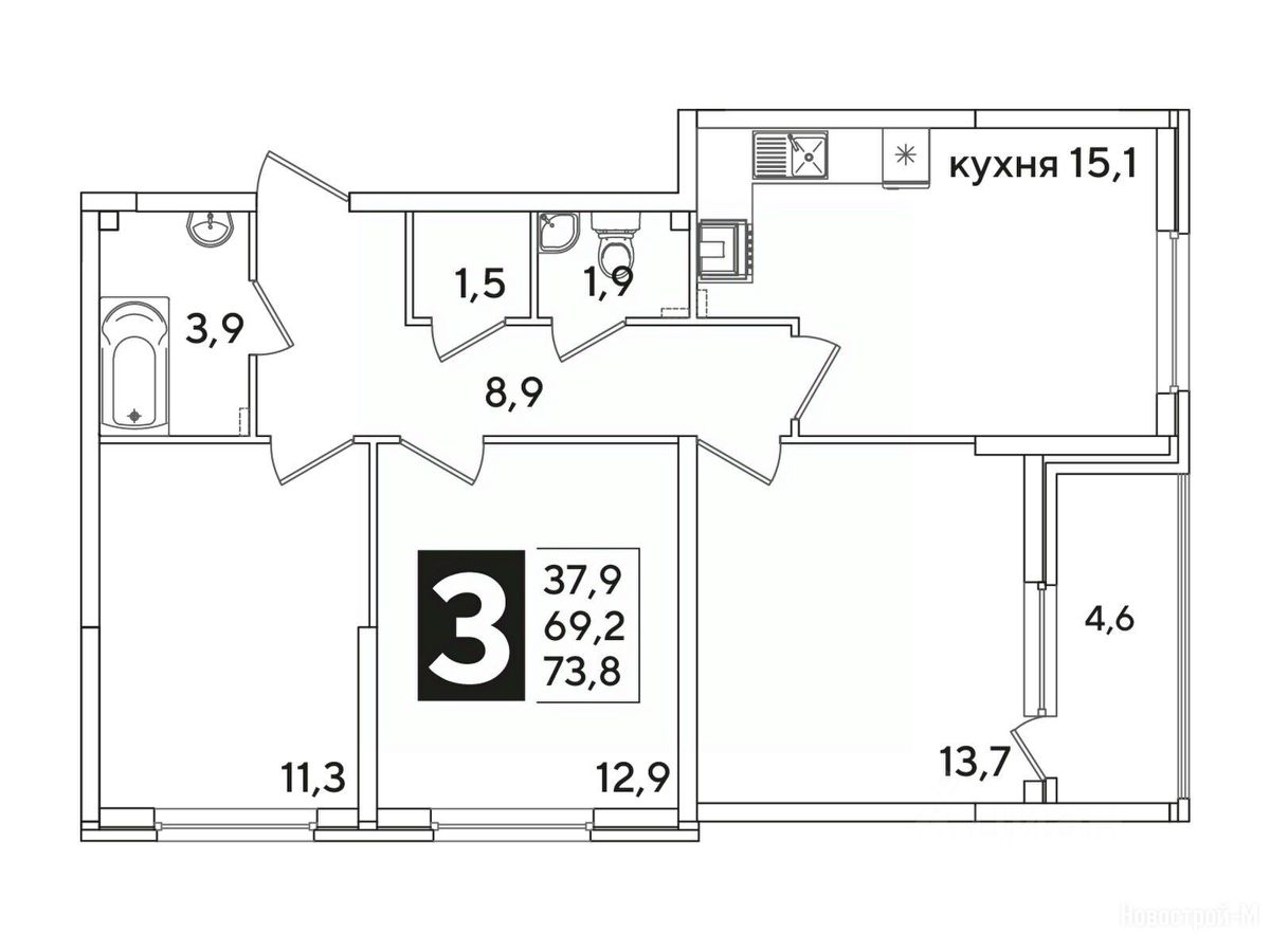 Площадь кухни15,1 м²