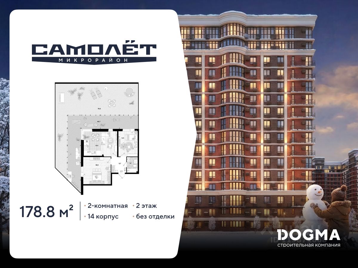 В продаже 2-комнатная квартира от застройщика! Мкр. "Самолет" 3 очередь, г. Краснодар, Литер 14 Срок сдачи: 4 кв. 2023, общей площадью 178.8 кв.м., на 2 этаже.