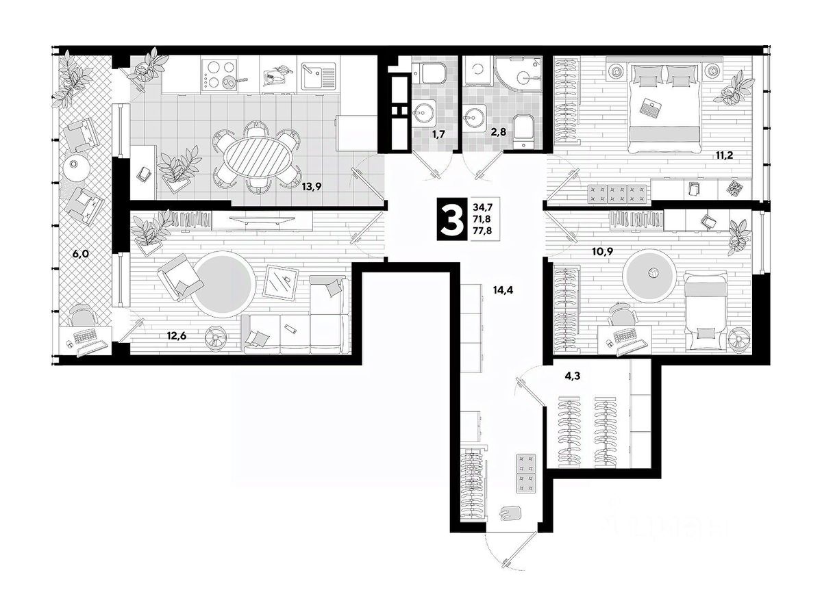 В продаже 3-комнатная квартира от застройщика! Мкр. "Самолет" 4 очередь, г. Краснодар, Литер 21 Срок сдачи: 4 кв. 2023, общей площадью 77.8 кв.м., на 12 этаже.