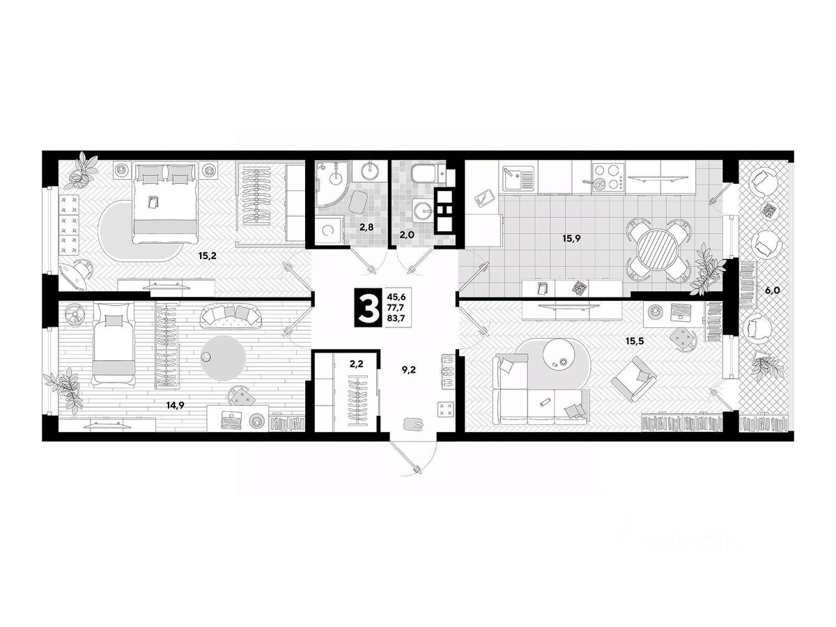 В продаже 3-комнатная квартира от застройщика! Мкр. "Самолет" 4 очередь, г. Краснодар, Литер 19 Срок сдачи: 3 кв. 2023, общей площадью 83.7 кв.м., на 3 этаже.