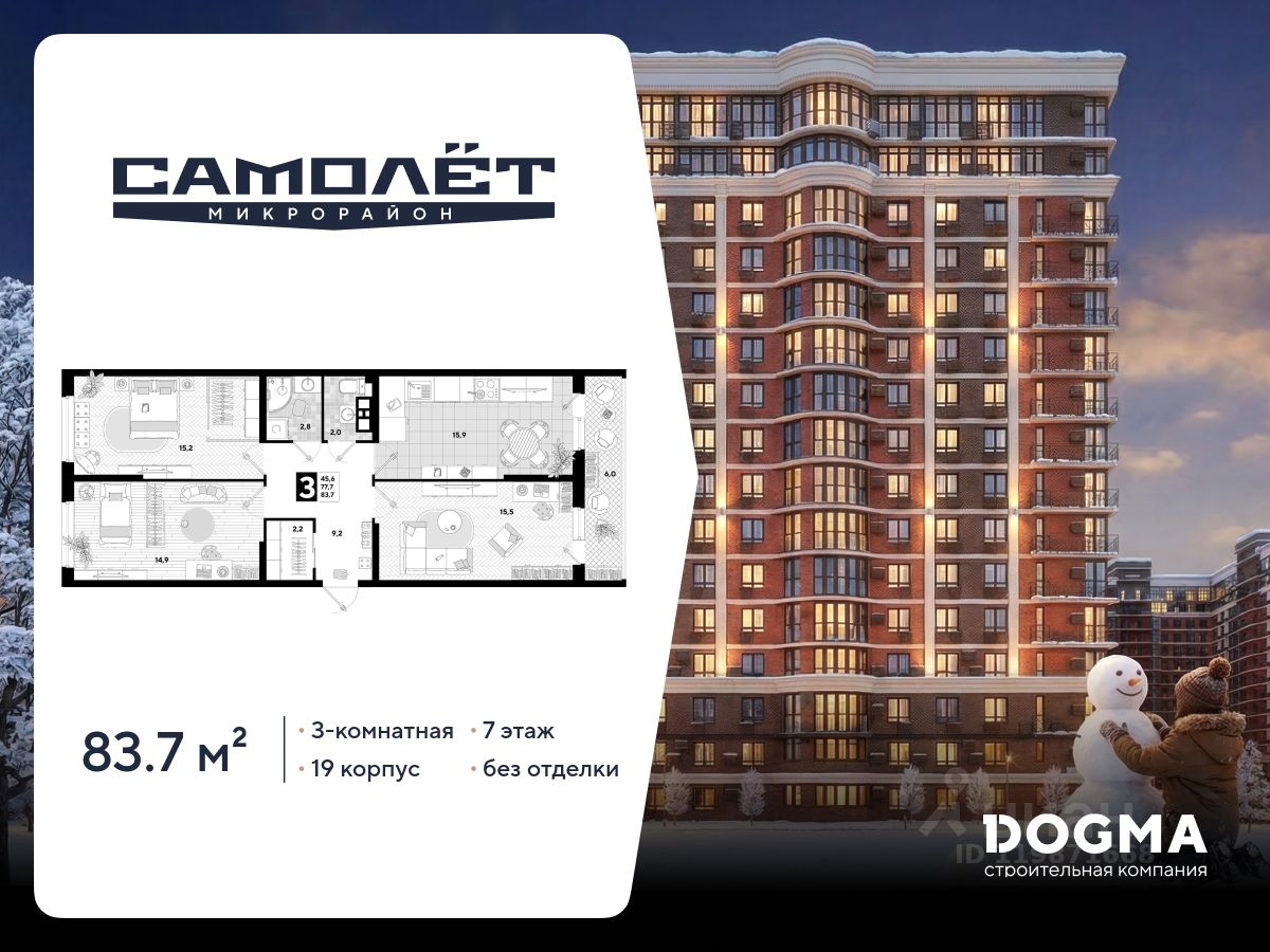 В продаже 3-комнатная квартира от застройщика! Мкр. "Самолет" 4 очередь, г. Краснодар, Литер 19 Срок сдачи: 3 кв. 2023, общей площадью 83.7 кв.м., на 7 этаже.