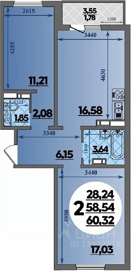 Продаётся 2-комнатная квартира в строящемся доме (Литер 2), срок сдачи: III-кв. 2027, общей площадью 60.32 кв.м., на 8 этаже.