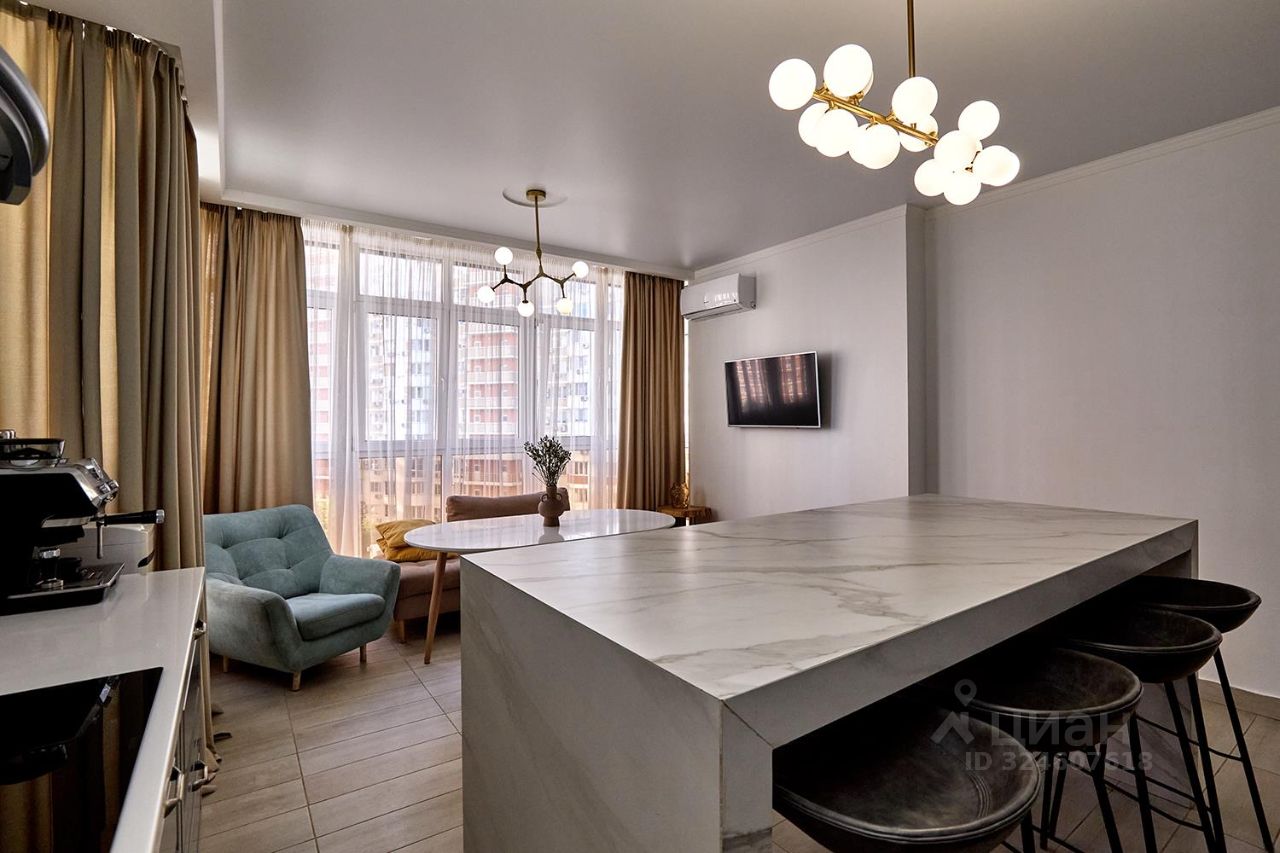 Редкий лот продажи в недвижимости! Квартира с ремонтом, остается вся мебель и встроенная бытовая техника. Отличная планировка на две стороны с видом на реку Кубань, просторные комнаты, высокие потолки, два санузла, большой холл и кухня-гостиная.