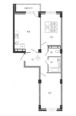 Планировка — бабочка с возможностью совместить комнату и кухню в единое пространство.