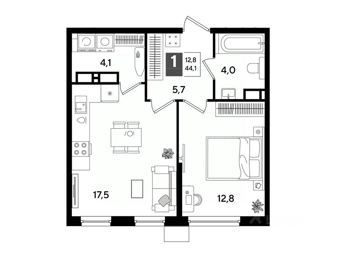 В продаже 1-комнатная квартира от застройщика! Мкр. "DOGMA PARK" г. Краснодар, Литер 31 Срок сдачи: 3 кв. 2027, общей площадью 44.1 кв.м., на 12 этаже.