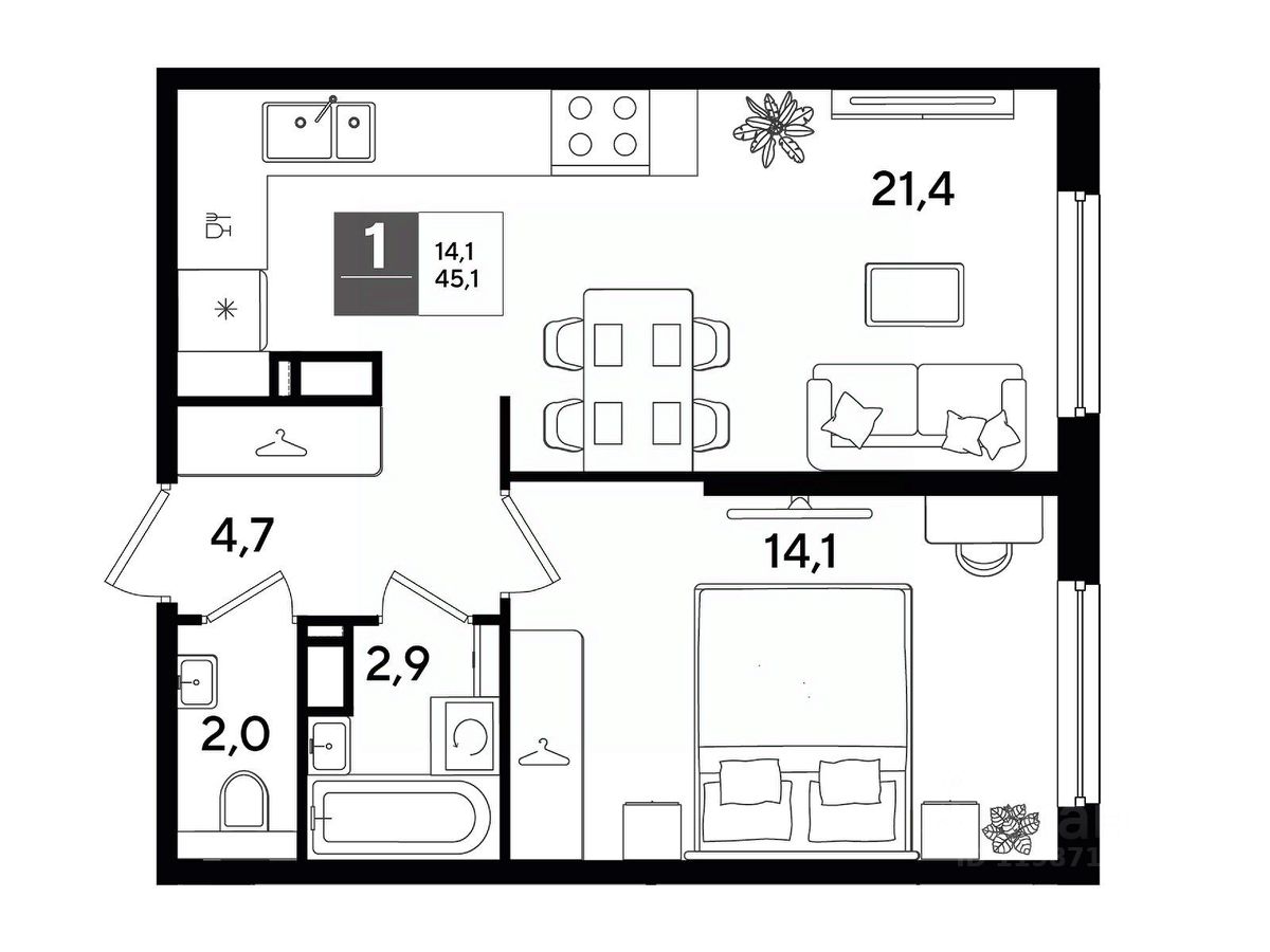 В продаже 1-комнатная квартира от застройщика! Мкр. "DOGMA PARK" г. Краснодар, Литер 22 Срок сдачи: 4 кв. 2027, общей площадью 45.1 кв.м., на 12 этаже.