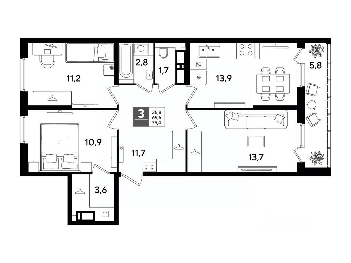 В продаже 3-комнатная квартира от застройщика! Мкр. "DOGMA PARK" г. Краснодар, Литер 22 Срок сдачи: 4 кв. 2027, общей площадью 75.7 кв.м., на 12 этаже.