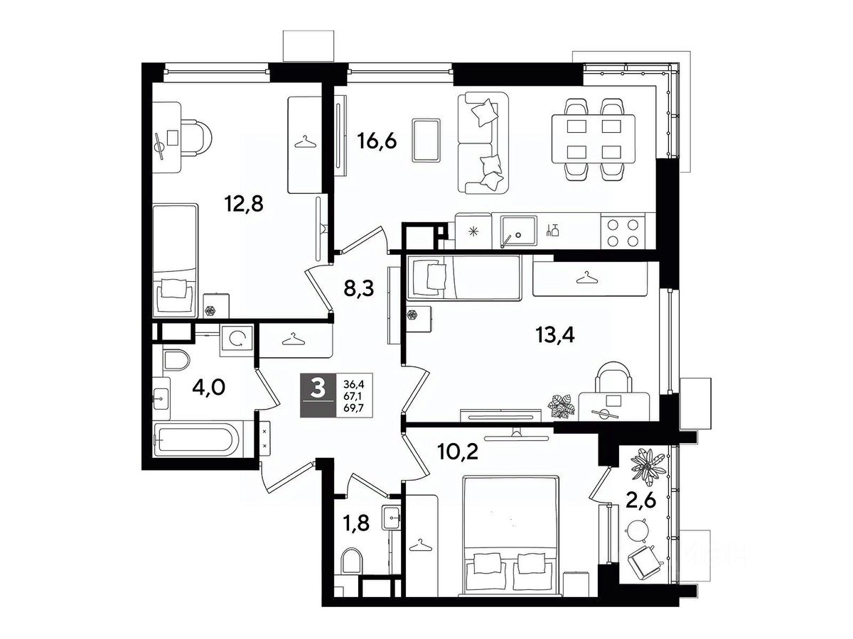 В продаже 3-комнатная квартира от застройщика! Мкр. "DOGMA PARK" г. Краснодар, Литер 23 Срок сдачи: 4 кв. 2027, общей площадью 69.7 кв.м., на 12 этаже.