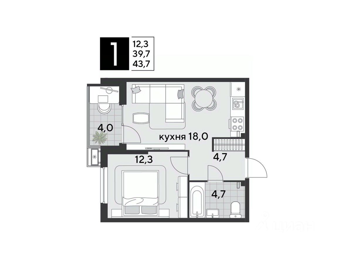 Срок сдачи: 1 кв. 2026, общей площадью 43.7 кв.м., на 2 этаже.