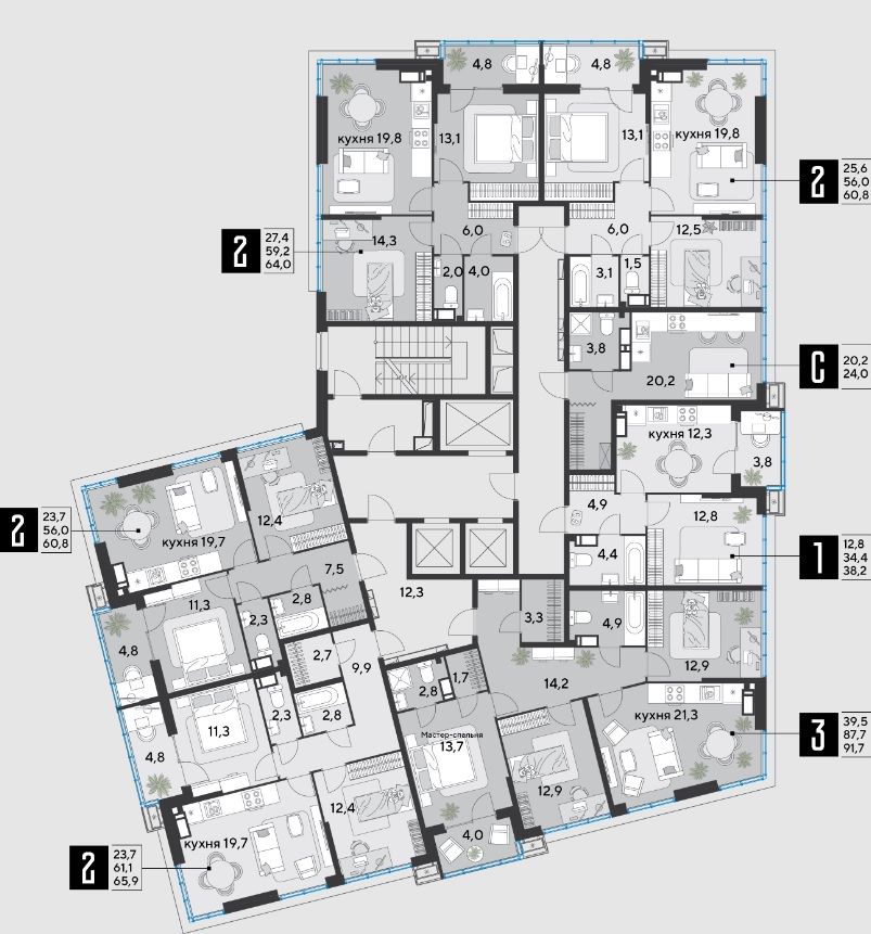 •Квартиры с мастер-спальнями и отдельными гардеробными