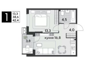 Срок сдачи: 1 кв. 2026, общей площадью 42.4 кв.м., на 2 этаже.