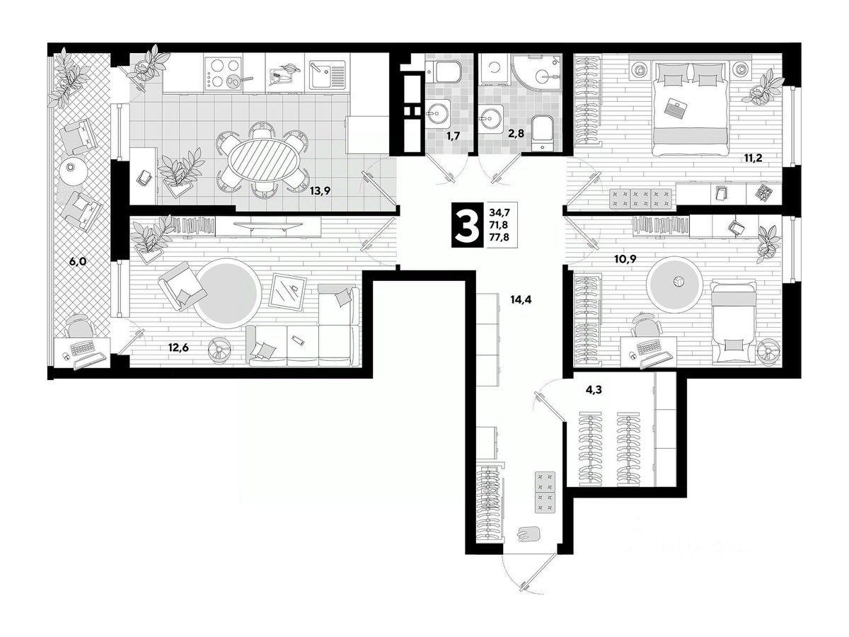В продаже 3-комнатная квартира от застройщика! Мкр. "Самолет" 5 очередь, г. Краснодар, Литер 29 Срок сдачи: 4 кв. 2024, общей площадью 77.6 кв.м., на 14 этаже.