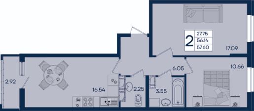 2 комнатная квартира 57.6 м² с ремонтом, на 10 этаже в жилом комплексе "Дом 101".