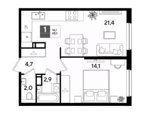 В продаже 1-комнатная квартира от застройщика! Мкр. "DOGMA PARK" г. Краснодар, Литер 22 Срок сдачи: 4 кв. 2027, общей площадью 45.1 кв.м., на 11 этаже.