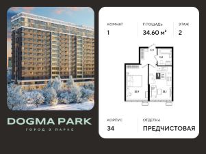 В продаже 1-комнатная квартира от застройщика! Мкр. "DOGMA PARK" г. Краснодар, Литер 34 Срок сдачи: 4 кв. 2027, общей площадью 34.6 кв.м., на 2 этаже.