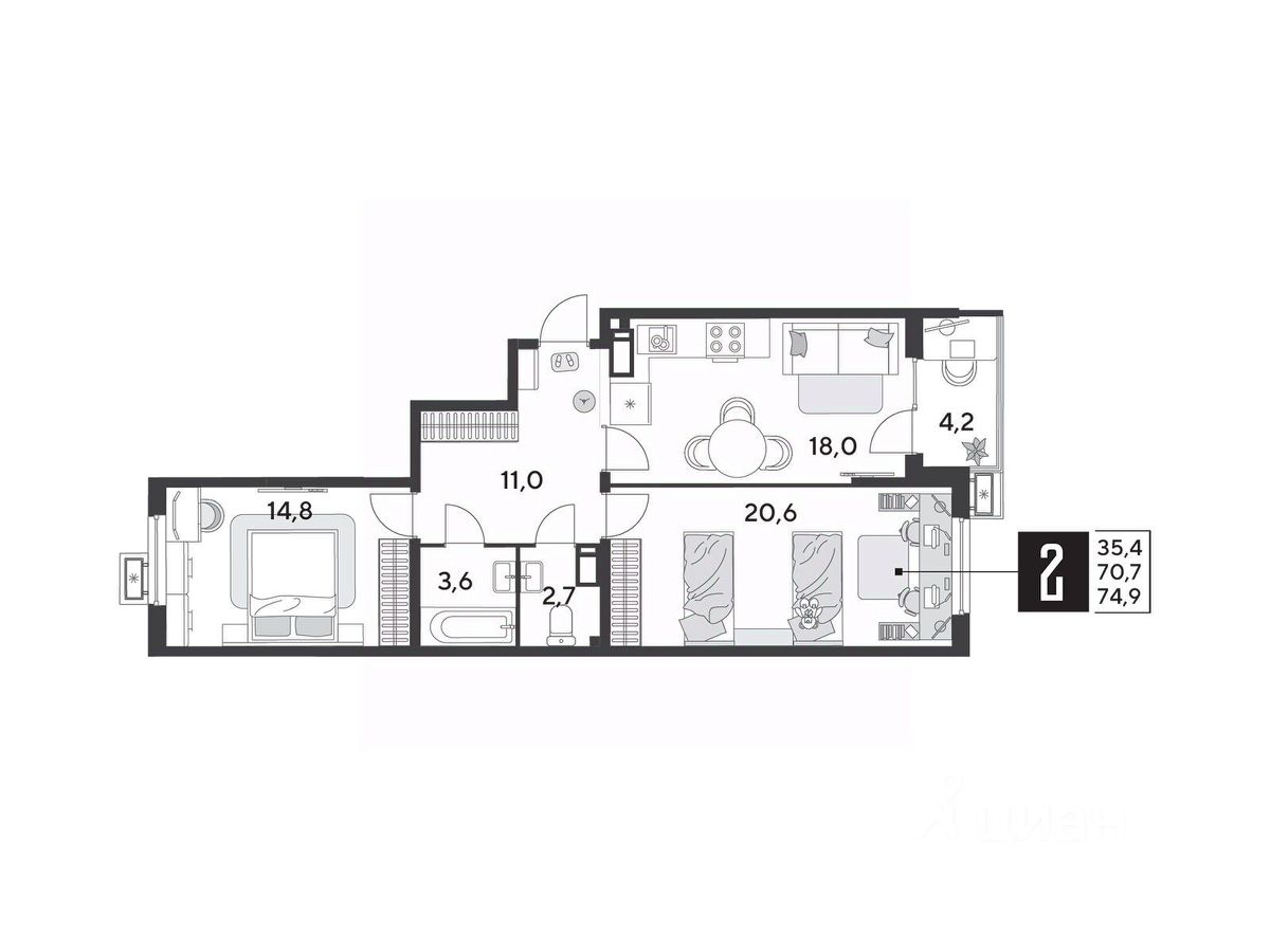 Срок сдачи: 1 кв. 2026, общей площадью 74.9 кв.м., на 15 этаже.