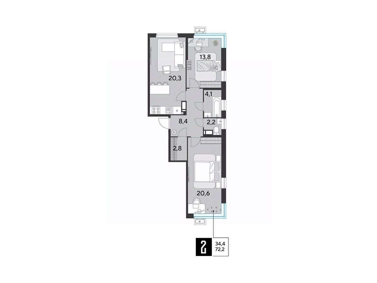 Срок сдачи: 2 кв. 2026, общей площадью 72.2 кв.м., на 15 этаже.