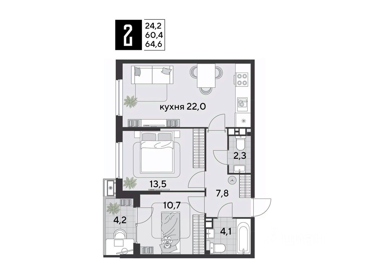 Срок сдачи: 1 кв. 2026, общей площадью 64.6 кв.м., на 7 этаже.