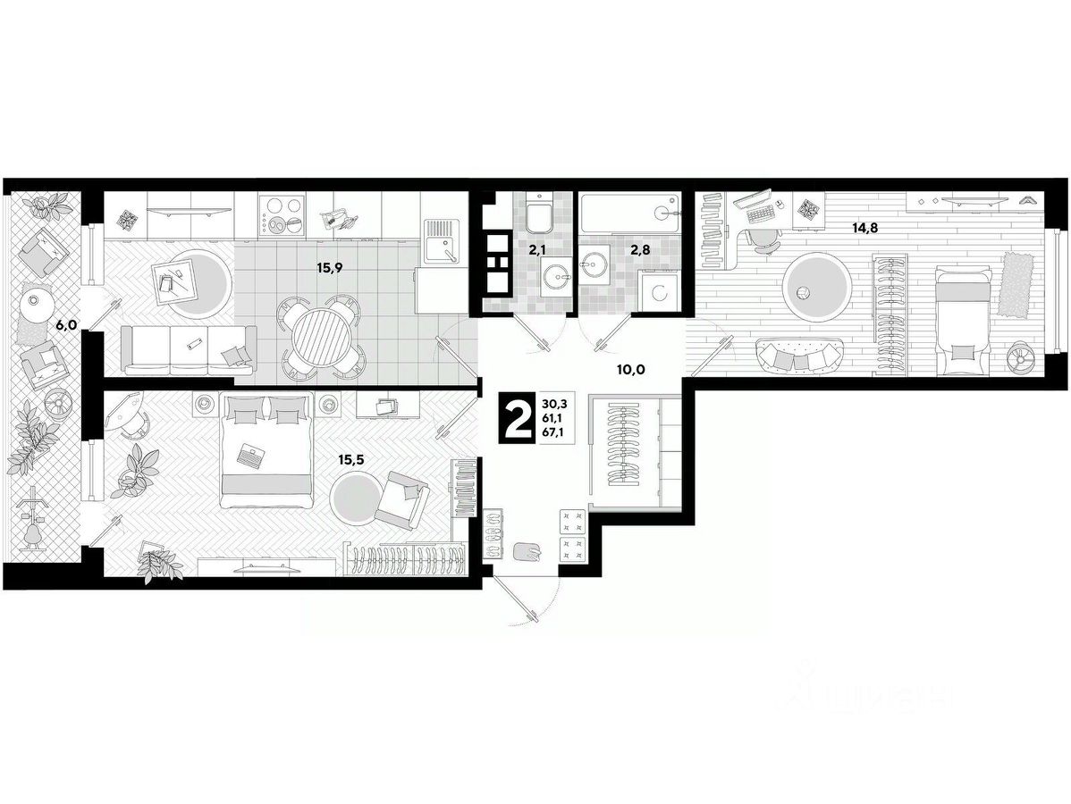В продаже 2-комнатная квартира от застройщика! Мкр. "Самолет" 4 очередь, г. Краснодар, Литер 24 4 кв. 2023, общей площадью 67.1 кв.м., на 3 этаже.
