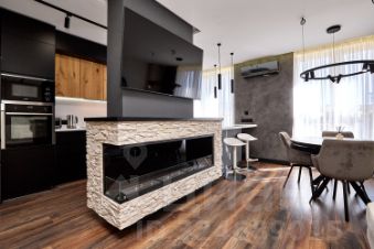 В центре зала красивый, современный био-камин на натуральном эко-топливе полного сгорания. Камин выполнен из декоративного камня с каменной столешницей, встроенными полками и различным уровнем подсветки. Над камином большой плазменный, все это создает уют и неимоверную атмосферу уюта и комфорта.