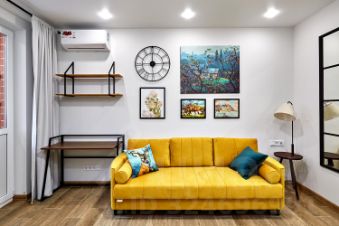 Умное зонирование и освещение: В студии организовано функциональное рабочее место под компьютер, установлен комфортный раскладной диван для сна. Точечное освещение и изысканный абажур создают особую атмосферу. Зеркало на всю стену визуально расширяет пространство.