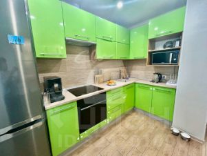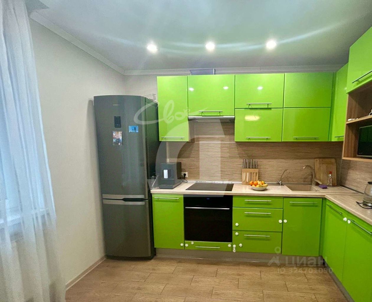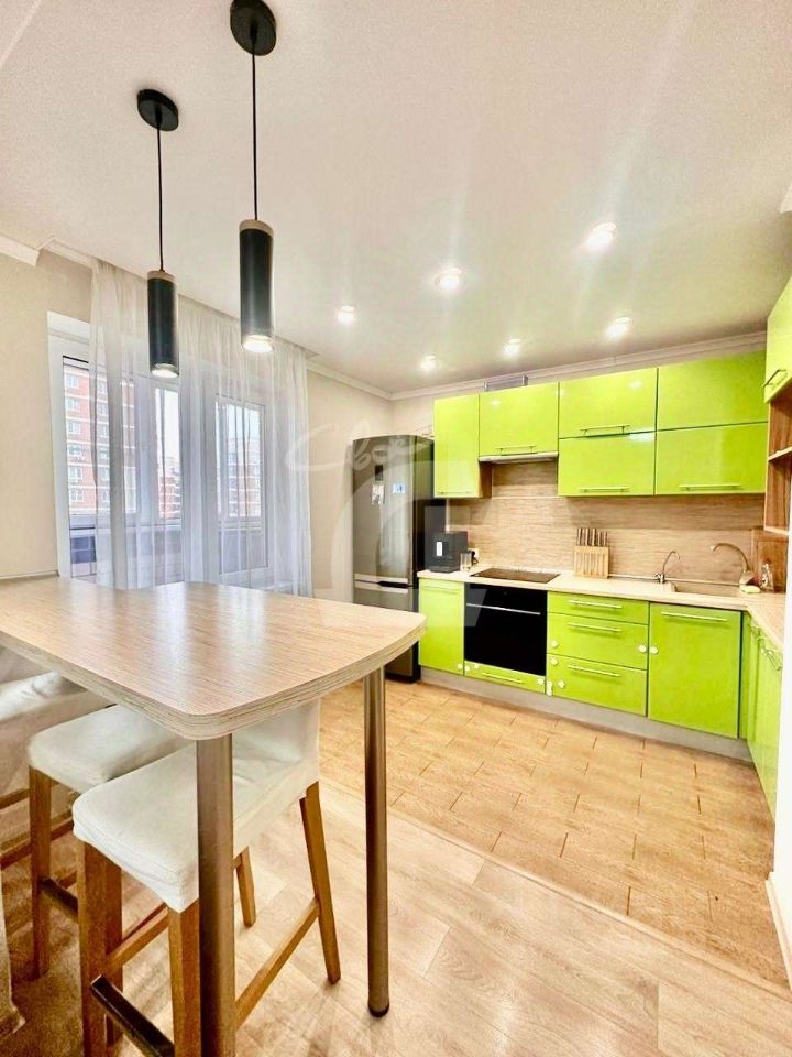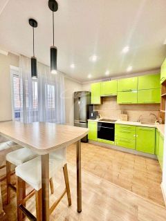 • В кухне установлен стильная кухонная стенка со встроенной техникой , барная стойка-стол со стульями , сплит-система, холодильник.