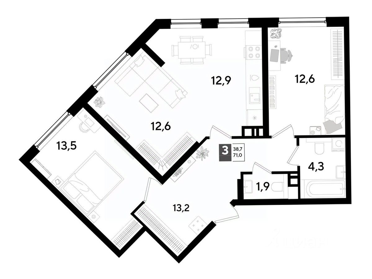 В продаже 3-комнатная квартира от застройщика! Мкр. "DOGMA PARK" г. Краснодар, Литер 30 Срок сдачи: 3 кв. 2027, общей площадью 71 кв.м., на 3 этаже.