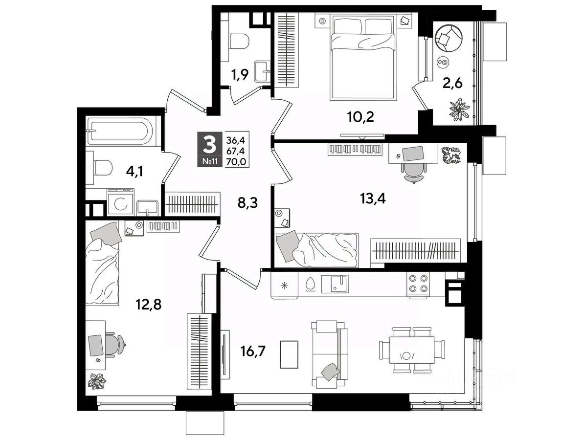 В продаже 3-комнатная квартира от застройщика! Мкр. "DOGMA PARK" г. Краснодар, Литер 33 Срок сдачи: 3 кв. 2027, общей площадью 70 кв.м., на 3 этаже.