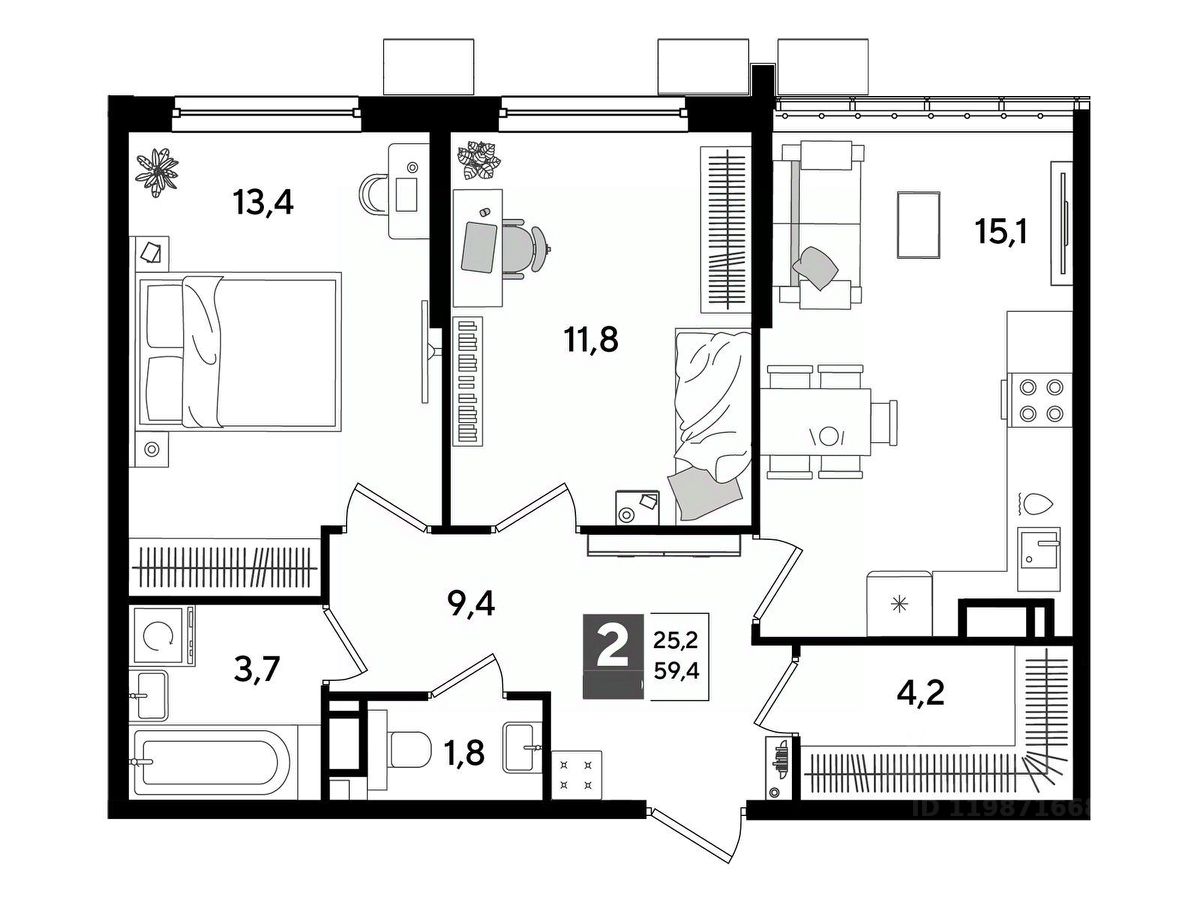 В продаже 2-комнатная квартира от застройщика! Мкр. "DOGMA PARK" г. Краснодар, Литер 33 Срок сдачи: 3 кв. 2027, общей площадью 59.4 кв.м., на 13 этаже.