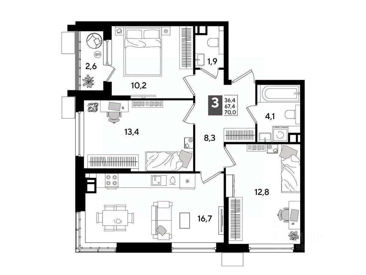 В продаже 3-комнатная квартира от застройщика! Мкр. "DOGMA PARK" г. Краснодар, Литер 31 Срок сдачи: 3 кв. 2027, общей площадью 70 кв.м., на 4 этаже.