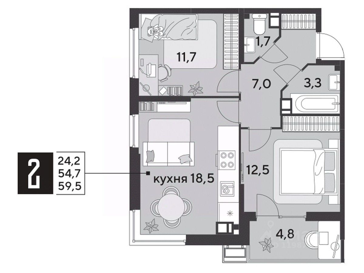 Срок сдачи: 1 кв. 2026, общей площадью 59.5 кв.м., на 4 этаже.