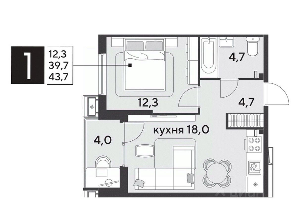 Срок сдачи: 1 кв. 2026, общей площадью 43.7 кв.м., на 2 этаже.