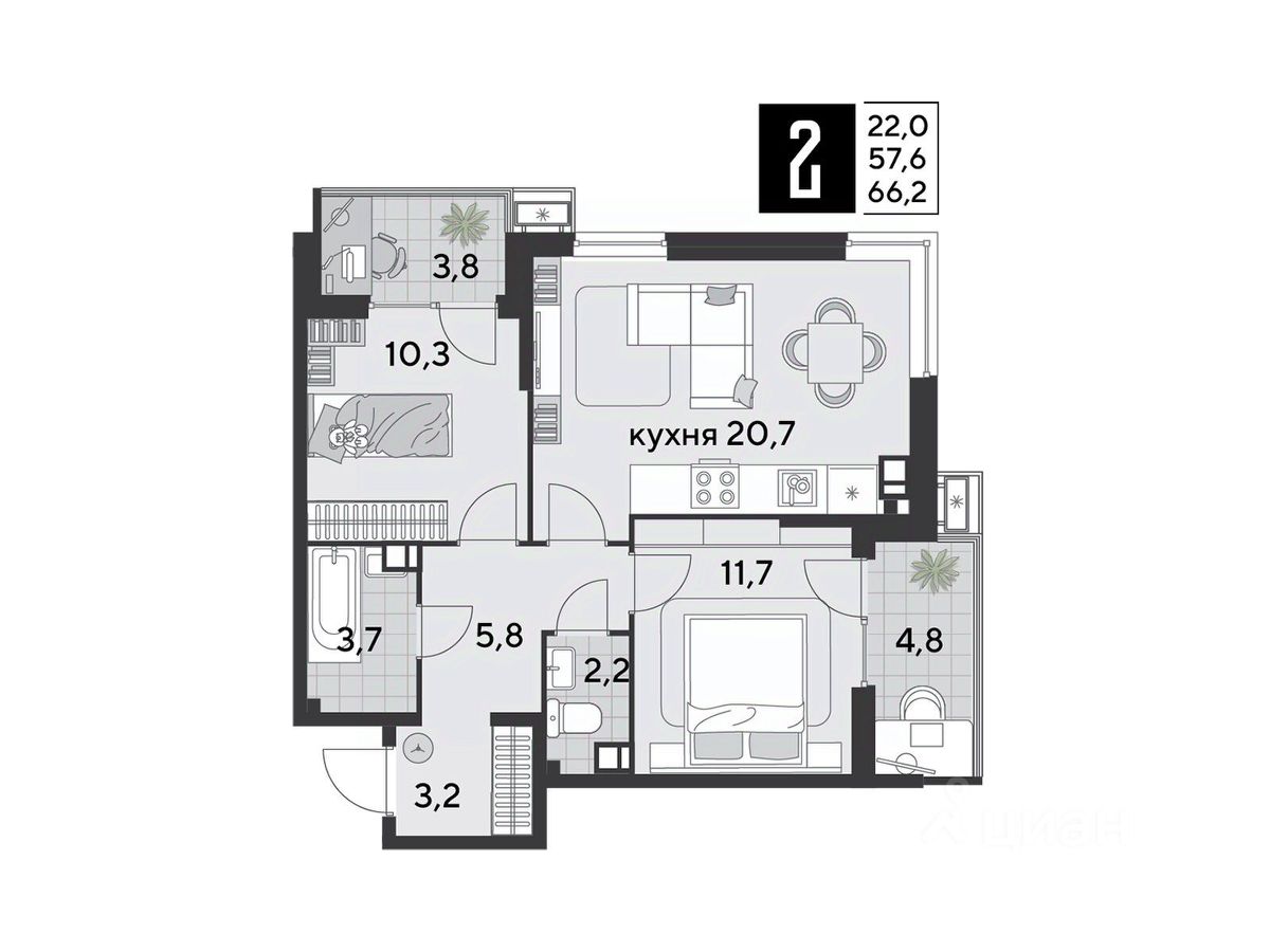 Срок сдачи: 1 кв. 2026, общей площадью 66.2 кв.м., на 6 этаже.