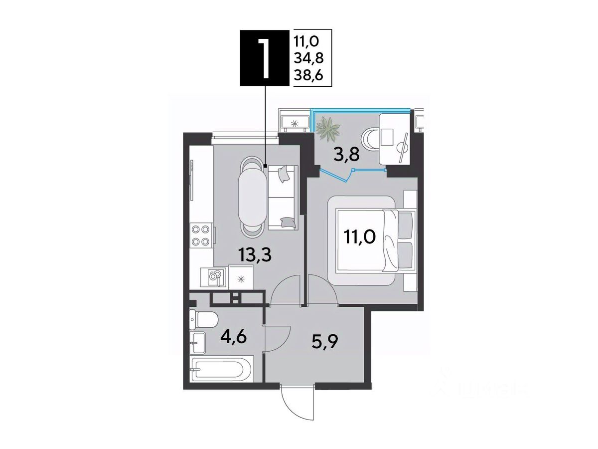 Срок сдачи: 2 кв. 2026, общей площадью 38.6 кв.м., на 14 этаже.