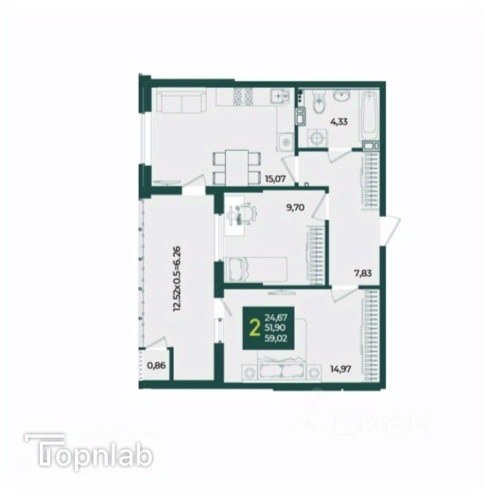 В продаже стильная 2 комнатная квартира с большой кухней 15.07м2 с выходом на ленточную лоджию 12.52м2, прихожая 7.83 м2 с зоной для гардероба.