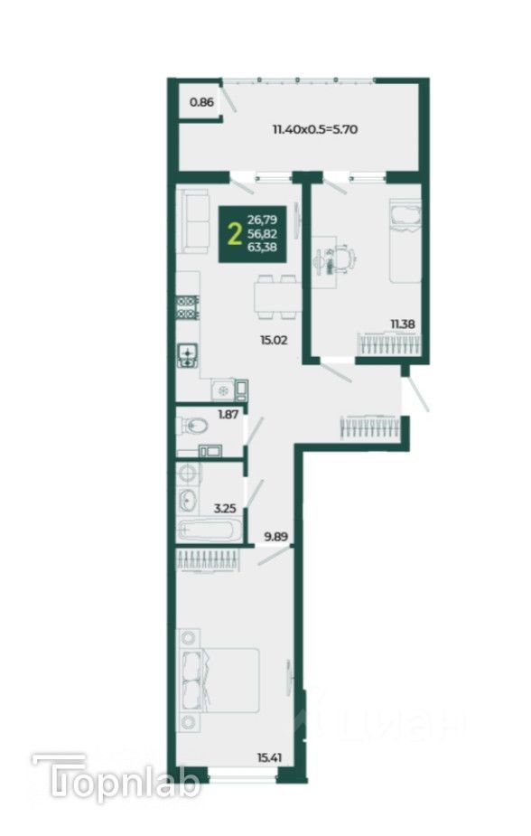 В продаже стильная 2 комнатная квартира с большой кухней 15.02 м2 с выходом на ленточную лоджию 11.40. м2, прихожая 9.89 м2 с зоной для гардероба.