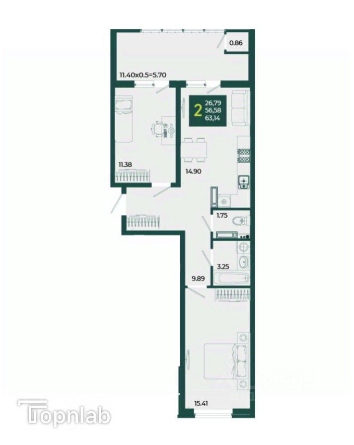 В продаже стильная 2 комнатная квартира с большой кухней 14,90м2. с выходом на ленточную лоджию 11,40 м2