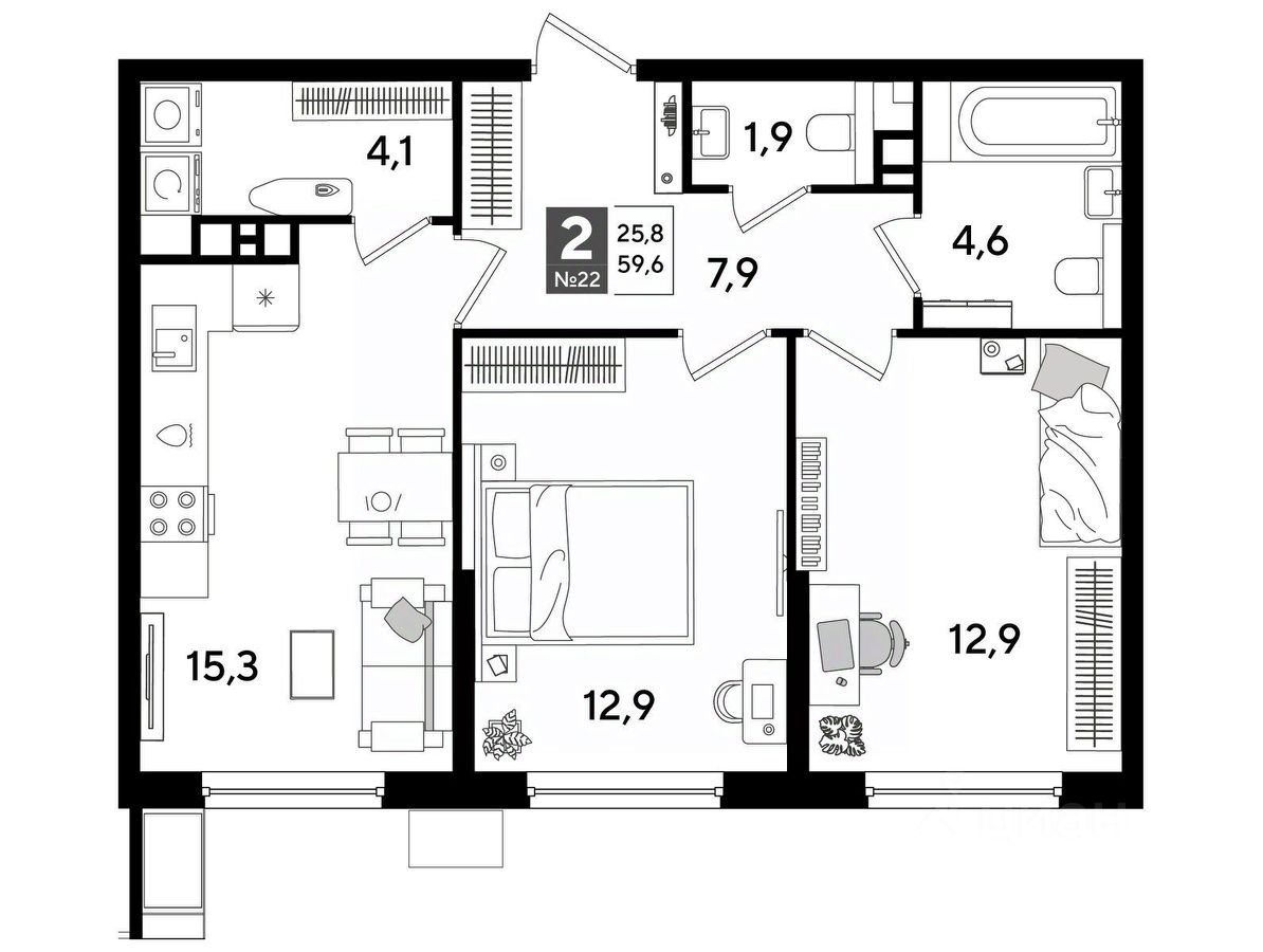 В продаже 2-комнатная квартира от застройщика! Мкр. "DOGMA PARK" г. Краснодар, Литер 17 4 кв. 2027, общей площадью 59 кв.м., на 6 этаже.