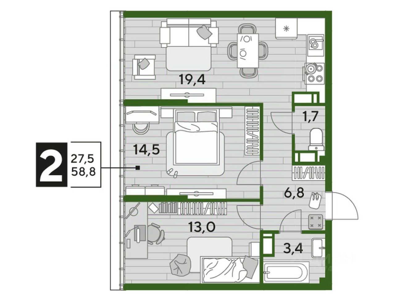 В продаже 2-комнатная квартира от застройщика! Мкр. "DOGMA PARK" г. Краснодар, Литер 19 4 кв. 2027, общей площадью 58.8 кв.м., на 13 этаже.