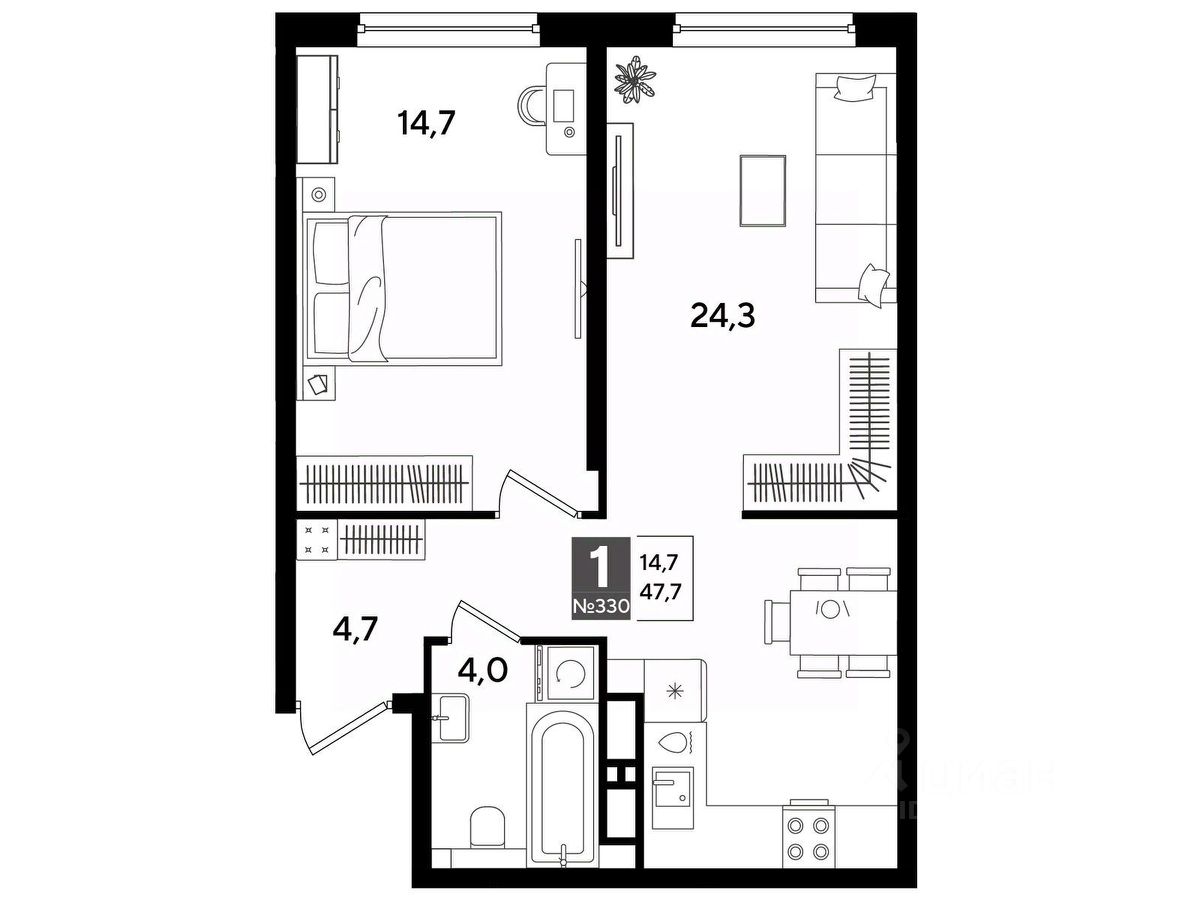 В продаже 1-комнатная квартира от застройщика! Мкр. "DOGMA PARK" г. Краснодар, Литер 19 4 кв. 2027, общей площадью 46.9 кв.м., на 16 этаже.